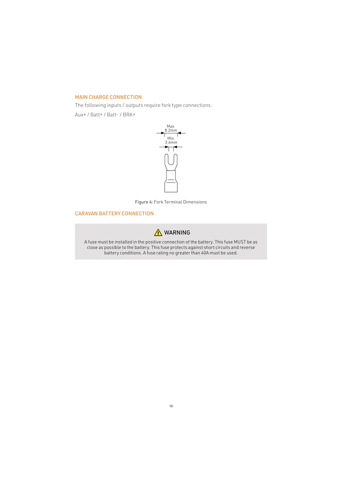 A fuse must be installed in the positive connection of the battery. This fuse MUST be as