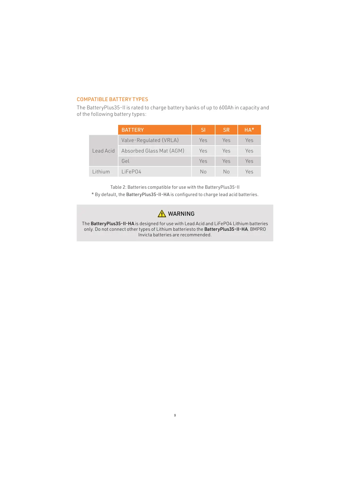 only. Do not connect other types of Lithium batteriesto the BatteryPlus35-II-HA. BMPRO