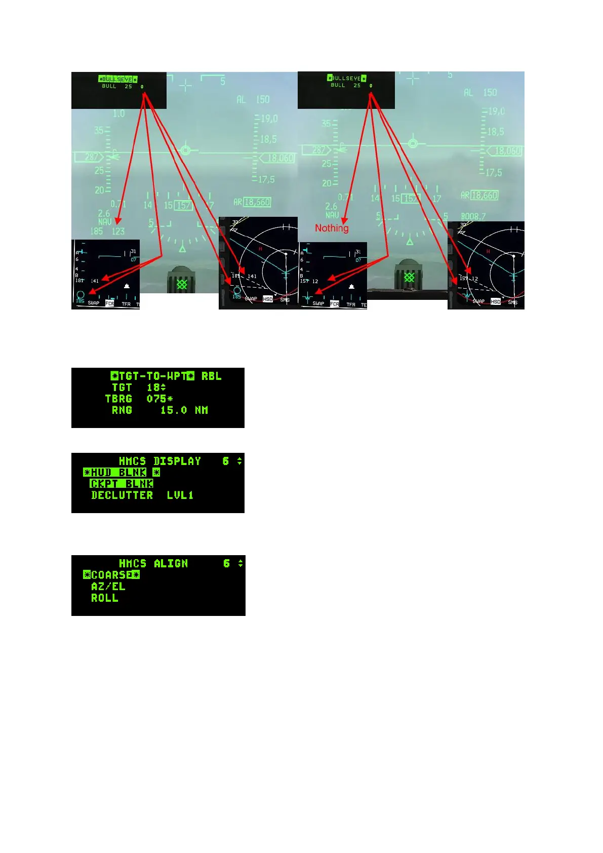 The left picture shows the HUD, FCR and HSD Bullseye symbols when BULLSEYE is mode selected;