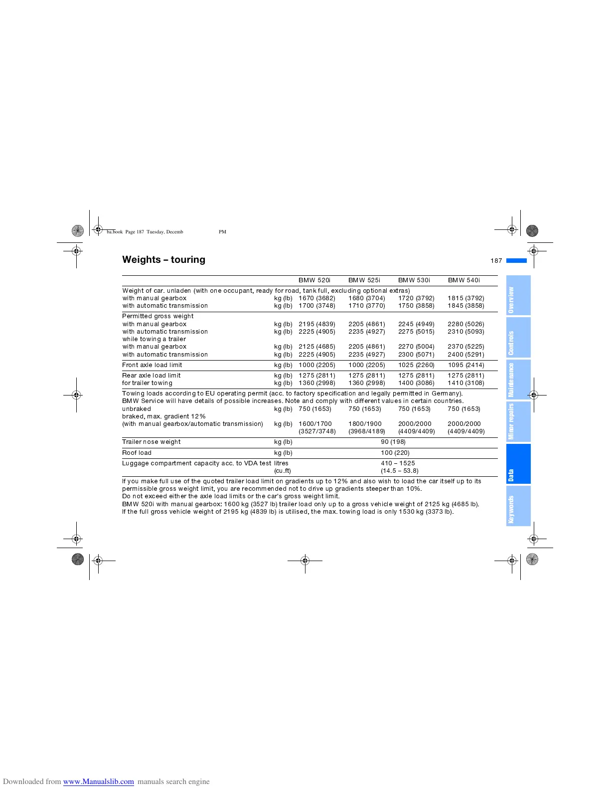 BMW 520i with manual gearbox: 1600 kg (3527 lb) trailer load only up to a gross vehicle weight of 2125 kg (4685 lb).