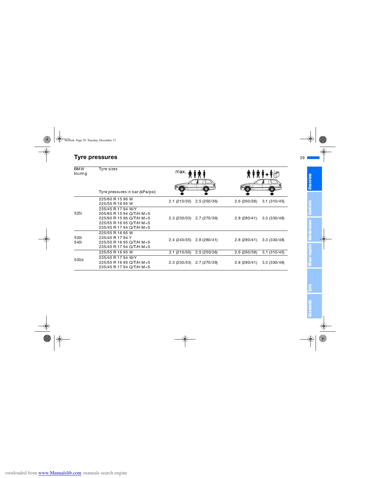 225/55 R 16 95 W 2.1 (210/30) 2.5 (250/36) 2.6 (260/38) 3.1 (310/45)