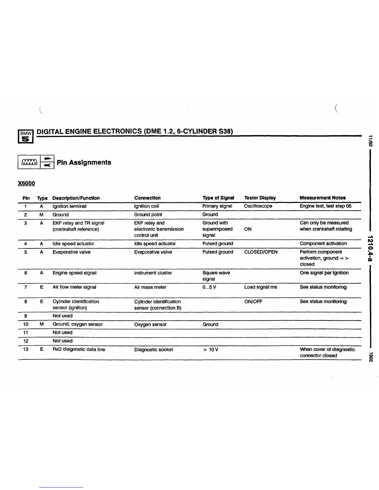 BMW 525it - DME M1.2, 6-Cylinder S38 Pin Assignments