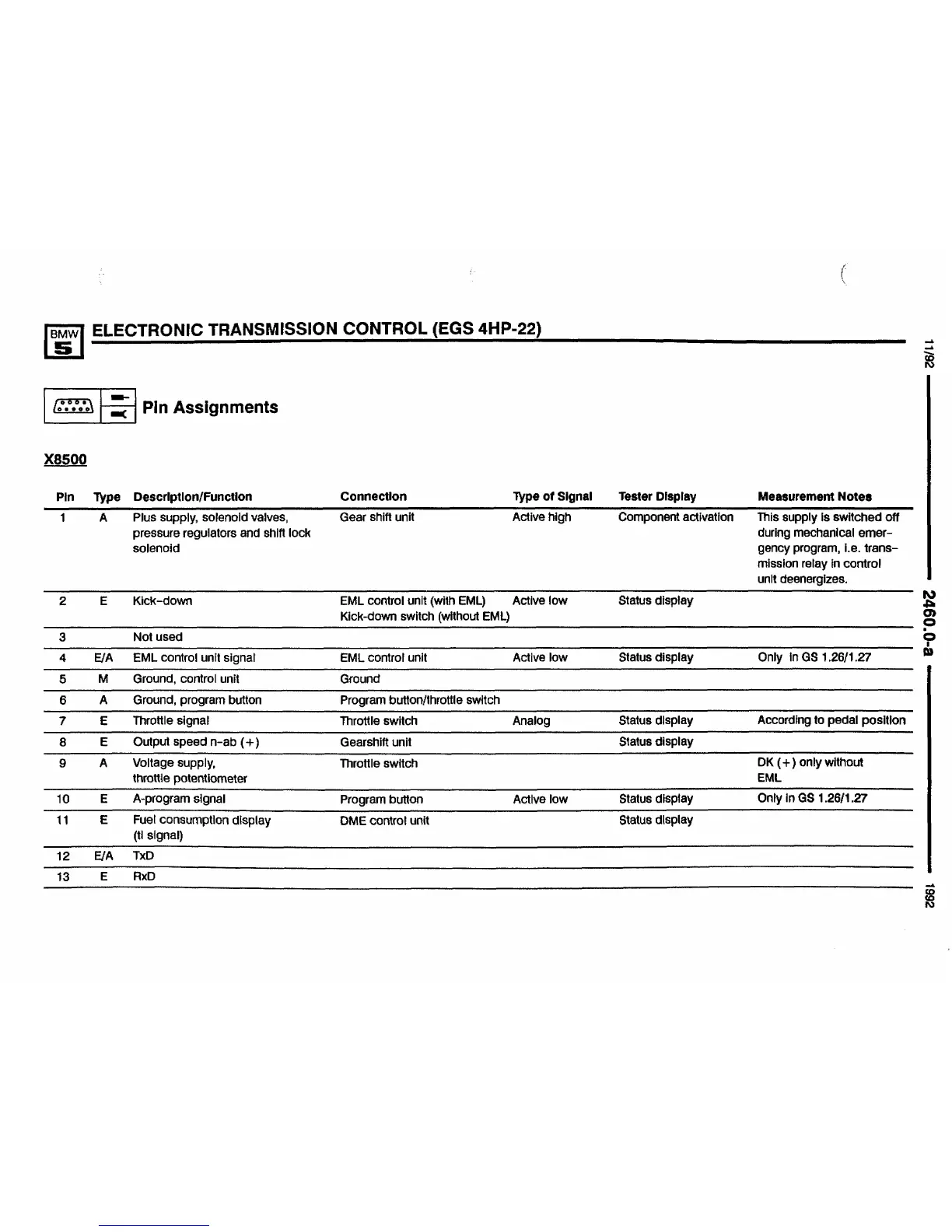 BMW 525it - Transmission and Chassis Control Systems; Electronic Transmission Control (EGS 4 HP-22) Pin Assignments