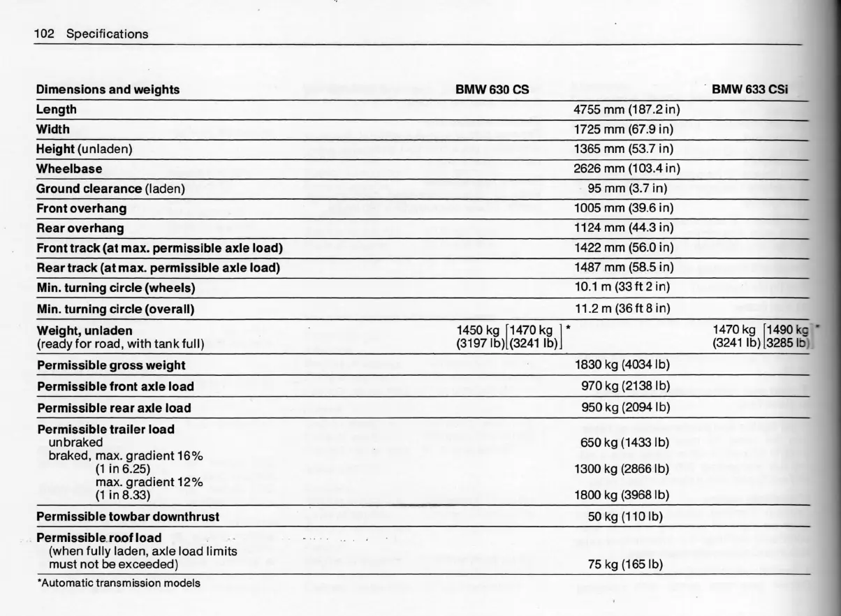 Dlmensions and weights BMW 630 CS . BMW 633 Csi