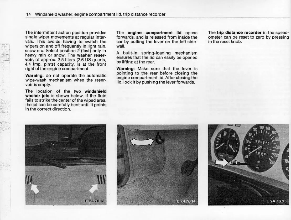 14 Windshield washer, engine compartment lid, trip distance recorder