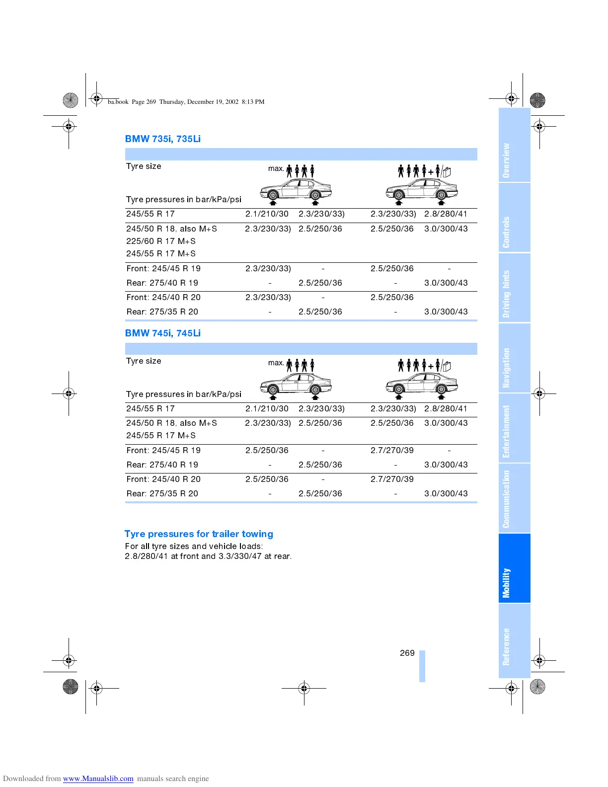 Front: 245/45 R 19 2.5/250/36 - 2.7/270/39 -