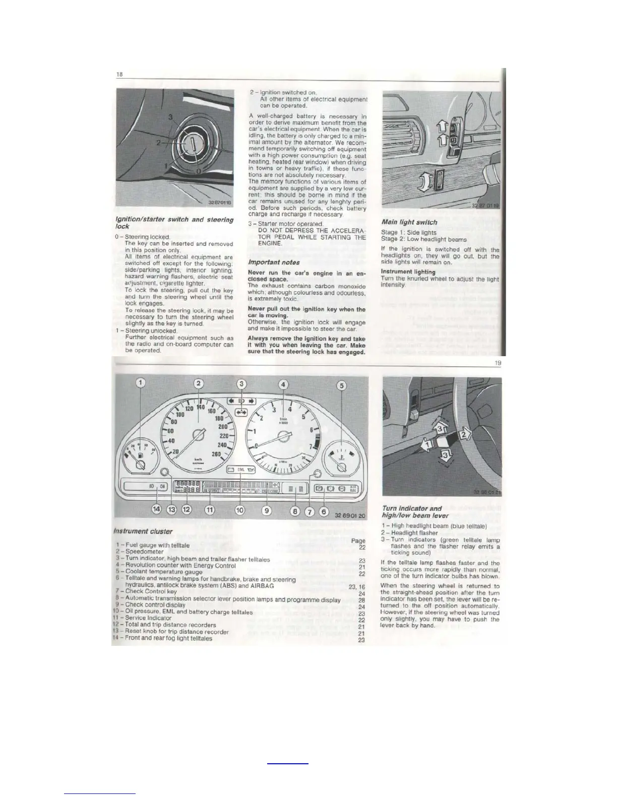 BMW E32 - Ignition, Lighting, and Instrument Cluster; Ignition Switch and Steering Lock; Main Light Switch and Instrument Lighting; Turn Indicator and Beam Lever Operation