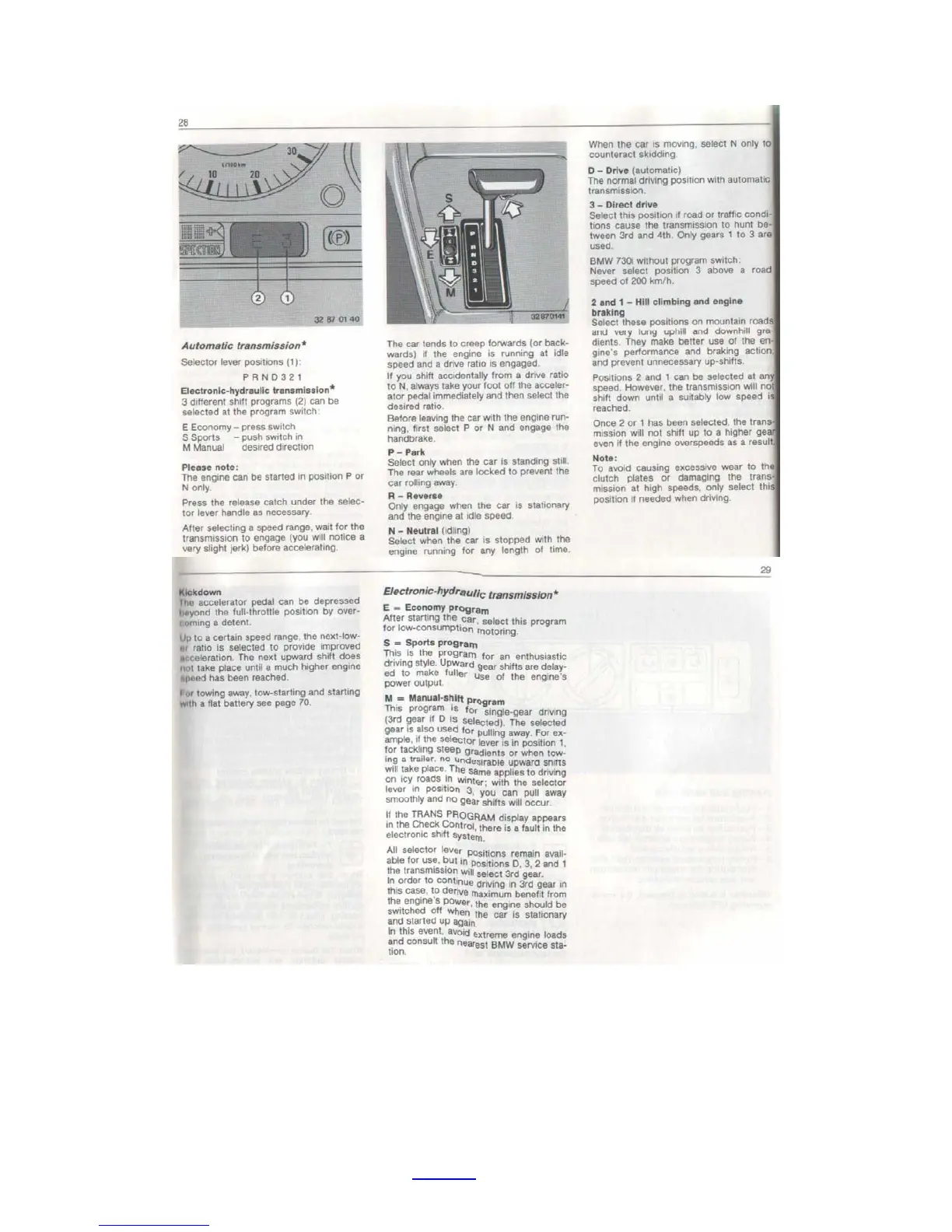 BMW E32 - Automatic Transmission and Shift Programs; Automatic Transmission Selector Lever; Shift Program Selection (E, S, M); Drive Modes and Special Conditions