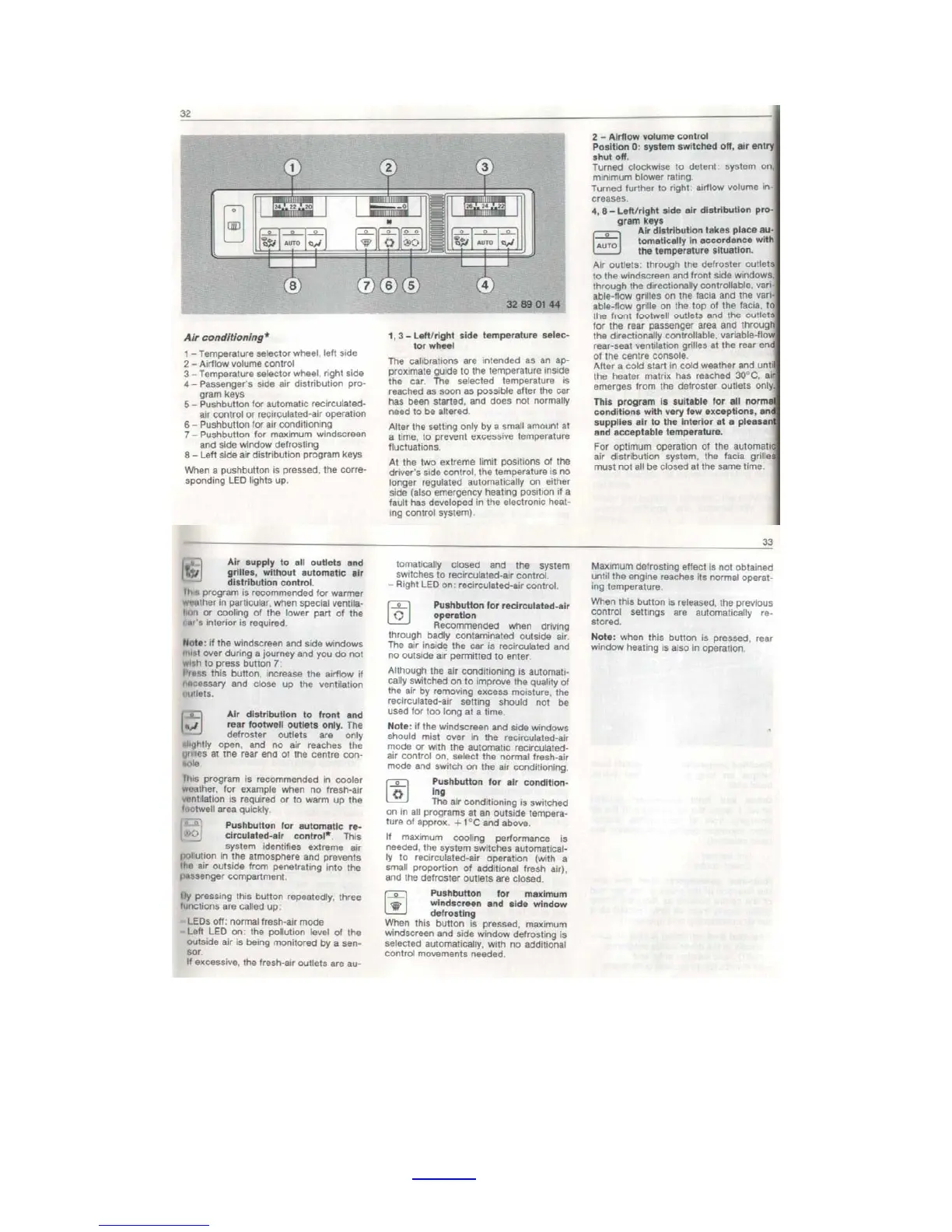 BMW E32 - Air Conditioning System Operation; Automatic Air Distribution and Recirculation; Air Conditioning and Defrosting Controls