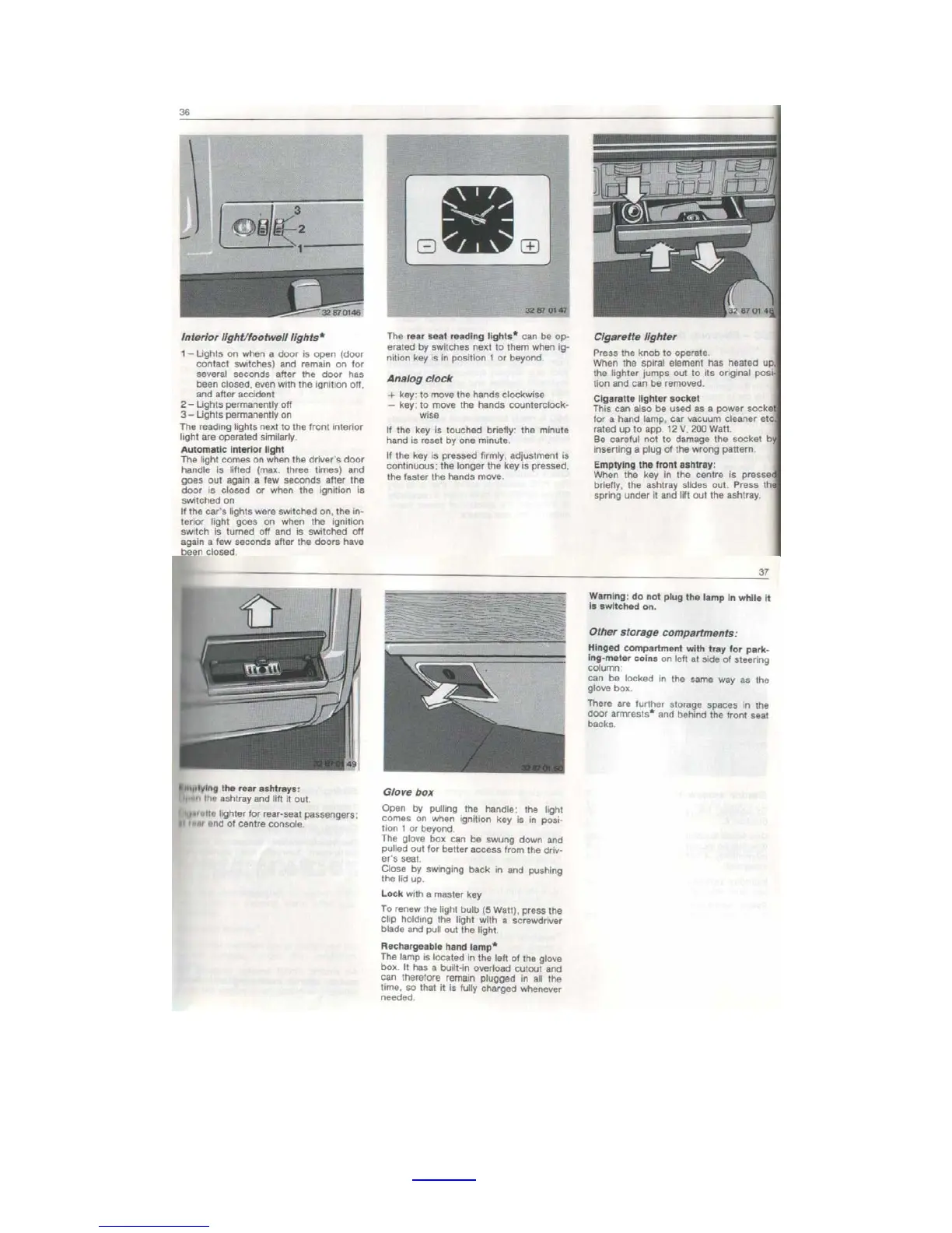 BMW E32 - Interior Lighting and Convenience Features; Interior Light and Footwell Light Operation; Analog Clock and Ashtray Operation; Glove Box and Other Storage