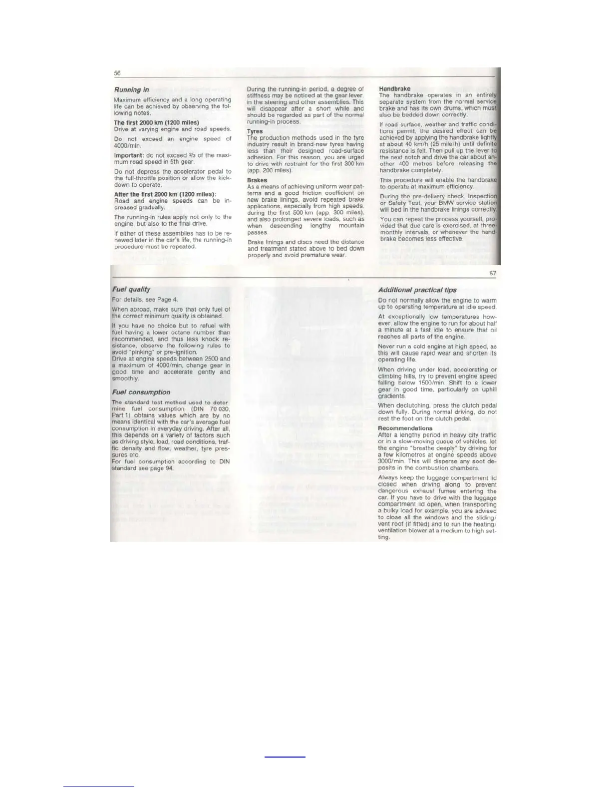 BMW E32 - Running-In Procedures and Additional Tips; Running-In Guidelines for New Vehicles; Tyre and Brake Running-In Procedures; Handbrake Operation and Driving Tips