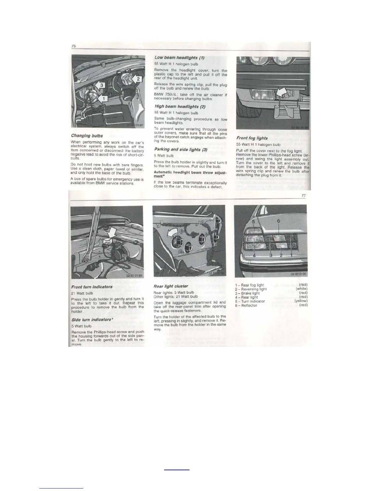 BMW E32 - Headlight and Lighting System Maintenance; Low and High Beam Headlight Bulb Replacement; Parking, Side, and Fog Light Bulb Replacement; Turn Indicator and Rear Light Cluster Bulb Replacement