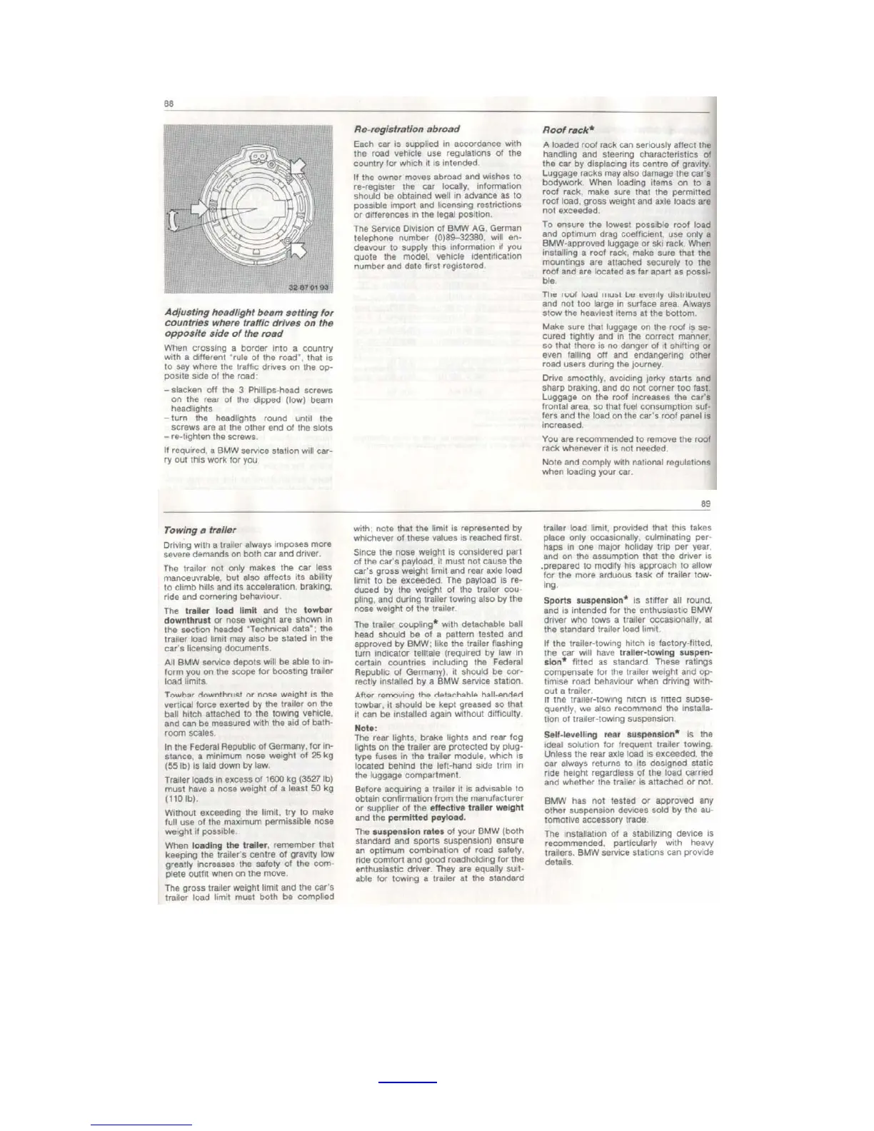 BMW E32 - Towing and Roof Rack Guidelines; Towing a Trailer and Trailer Load Limits; Roof Rack Installation and Usage