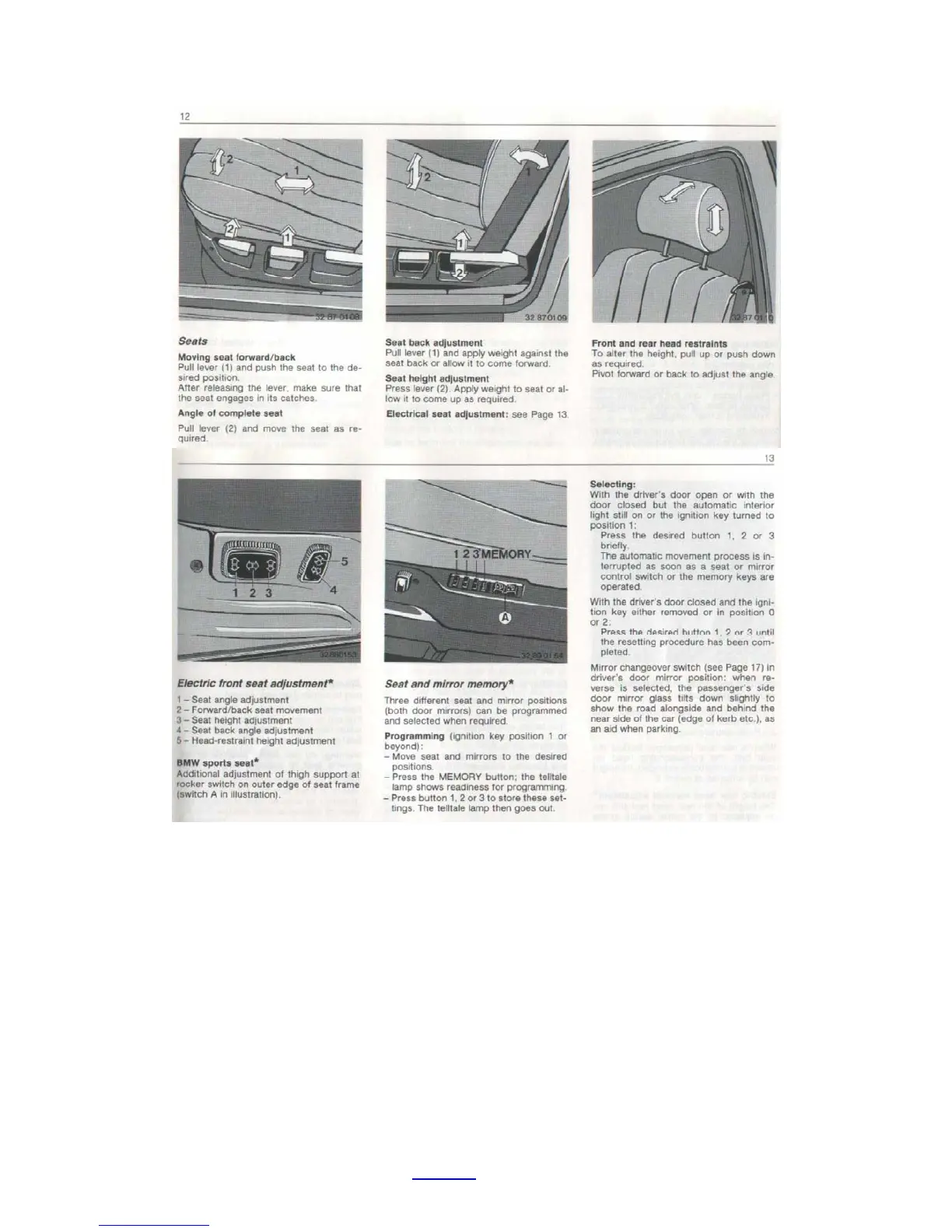 BMW E32 - Seat and Headrest Adjustments; Seat Back and Height Adjustment; Seat and Mirror Memory System