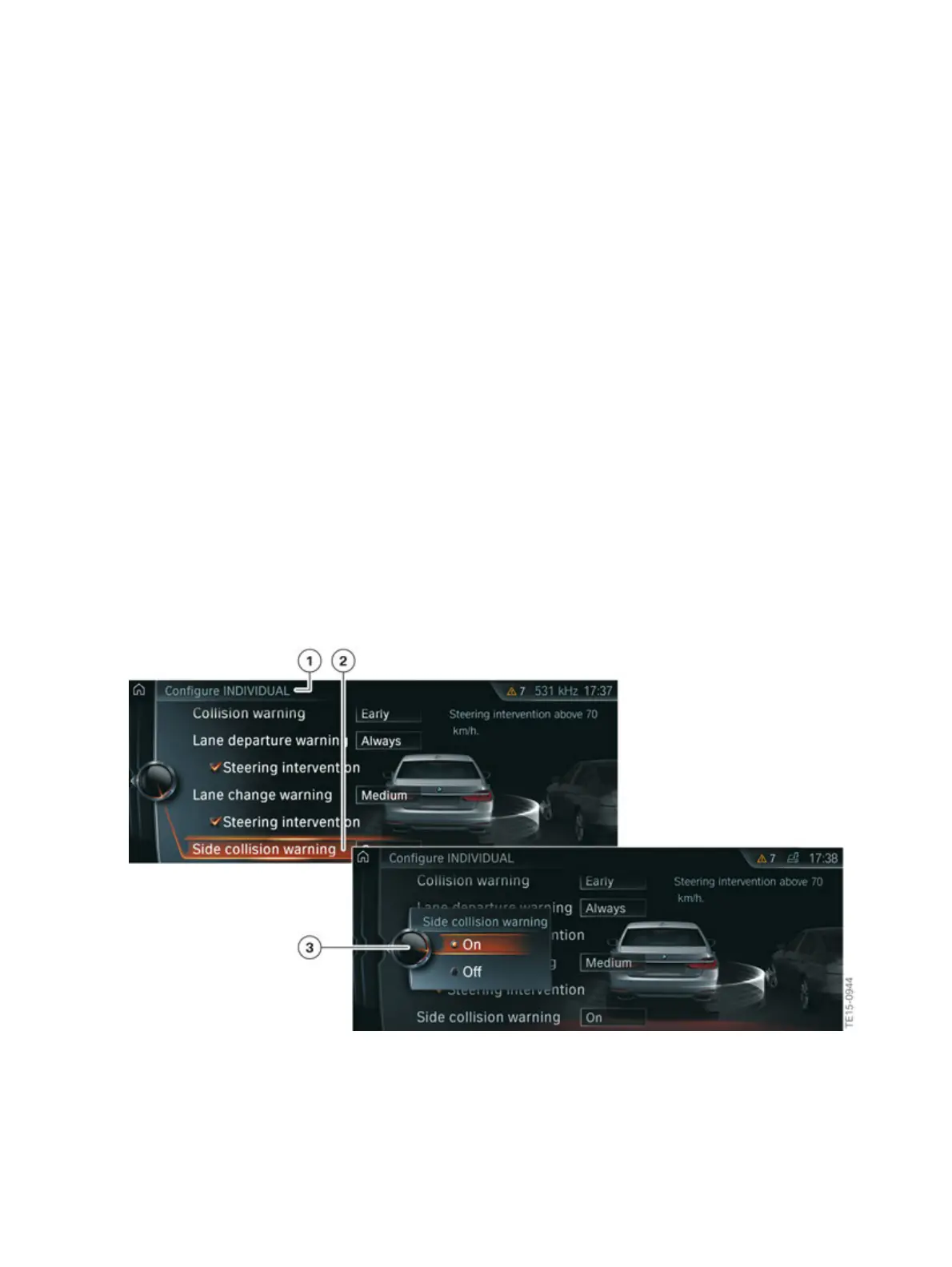 The�side�collision�warning�can�be�switched�on�and�off�in�the�iDrive�menu�by�making�the�following