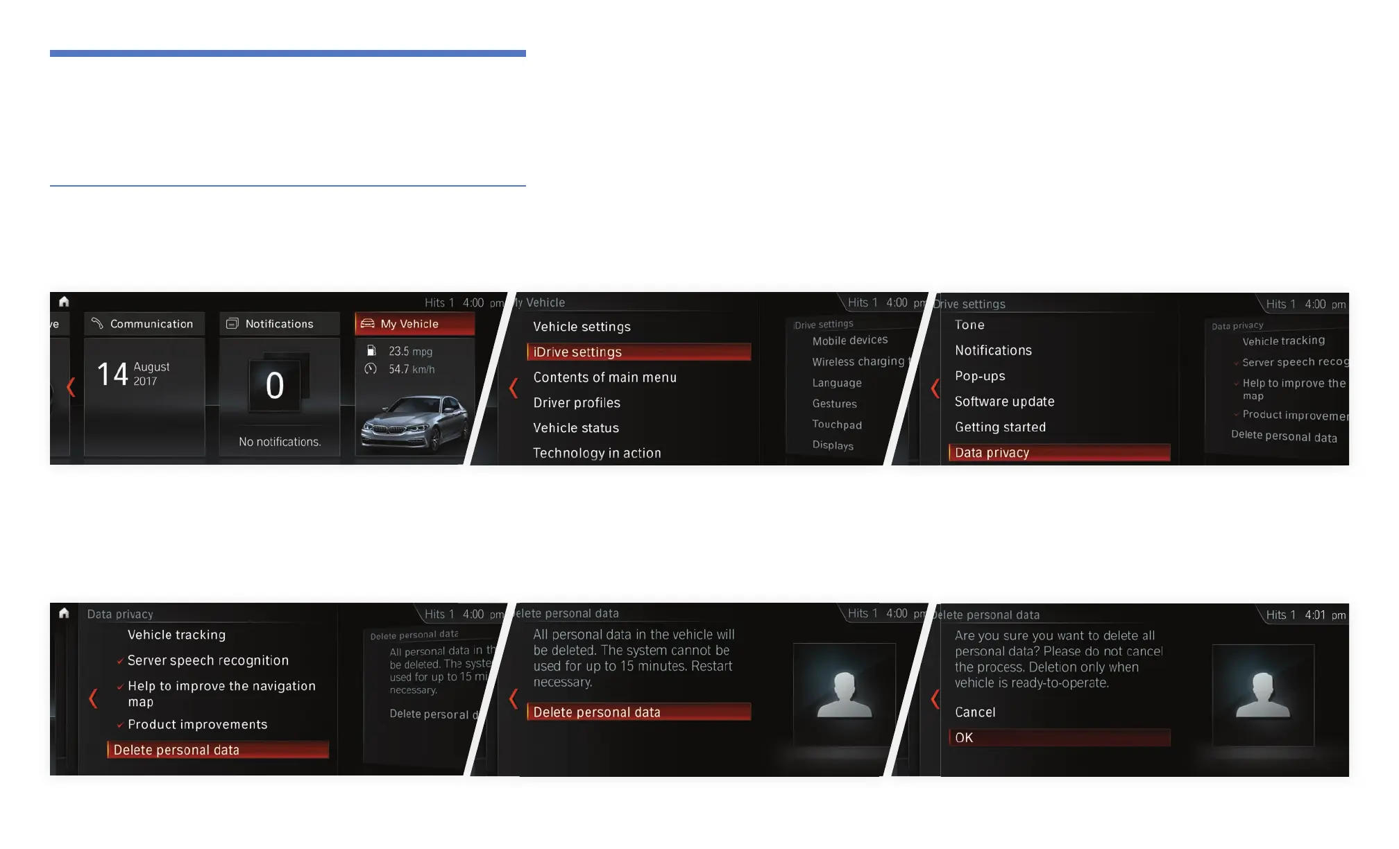 To delete personal data in vehicles equipped with iDrive 6, please follow these steps.