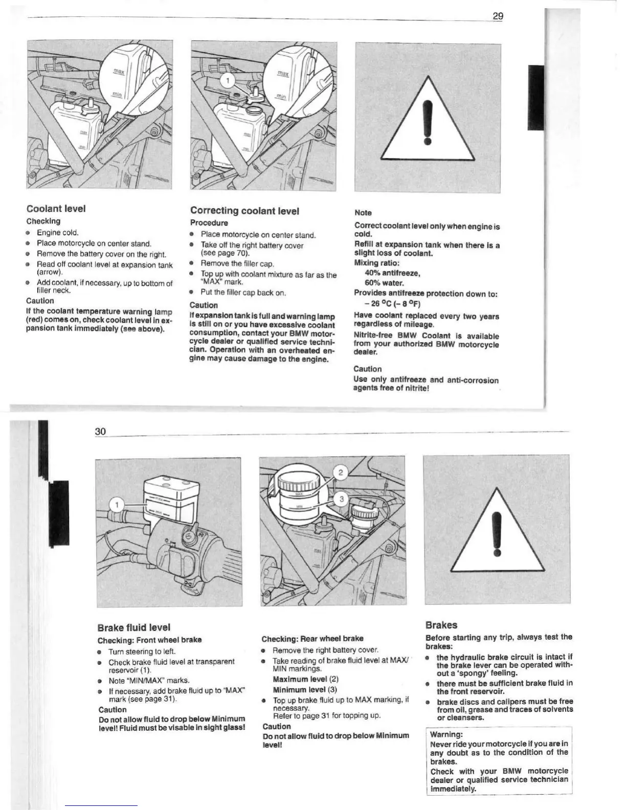 BMW K75 - Coolant Level; Correcting Coolant Level; Brake Fluid Level; Brakes