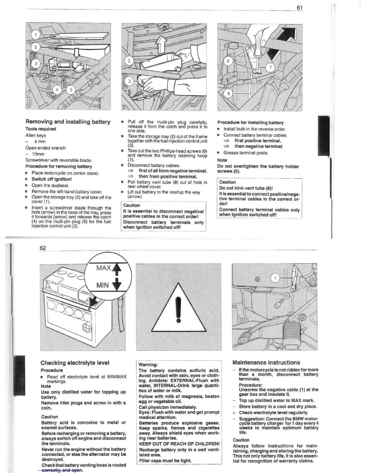 BMW K75 - Removing and Installing Battery; Checking Electrolyte Level; Maintenance Instructions