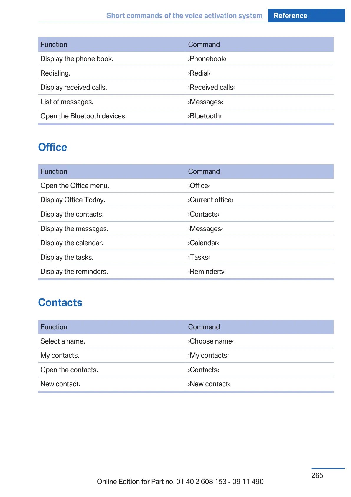 Short commands of the voice activation system Reference