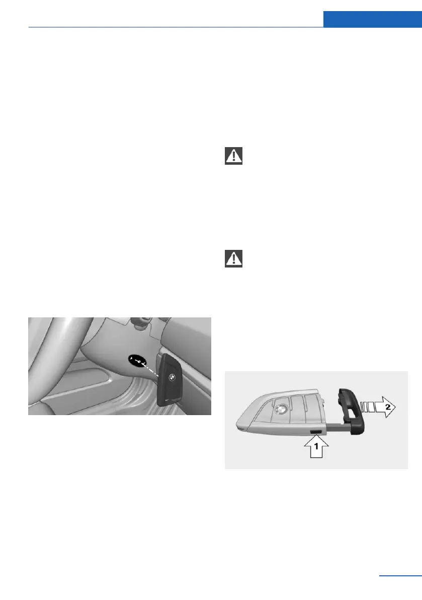 Press the button, arrow 1, and remove the key,