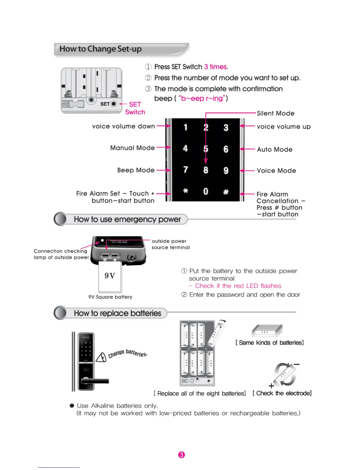 BNB Solutions Everlock BDS312 - How to Change Set-up; How to Use Emergency Power; How to Replace Batteries