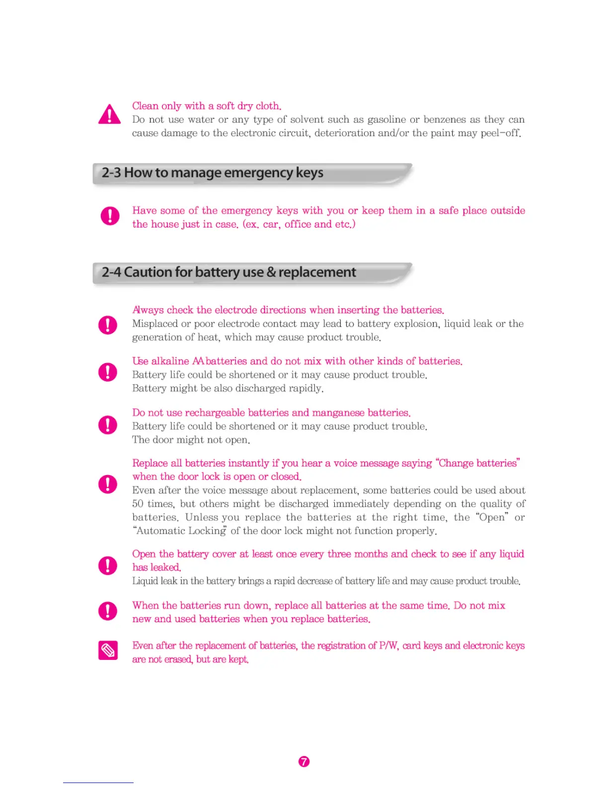 BNB Solutions Everlock BDS312 - 2-3 How to Manage Emergency Keys; 2-4 Caution for Battery Use & Replacement