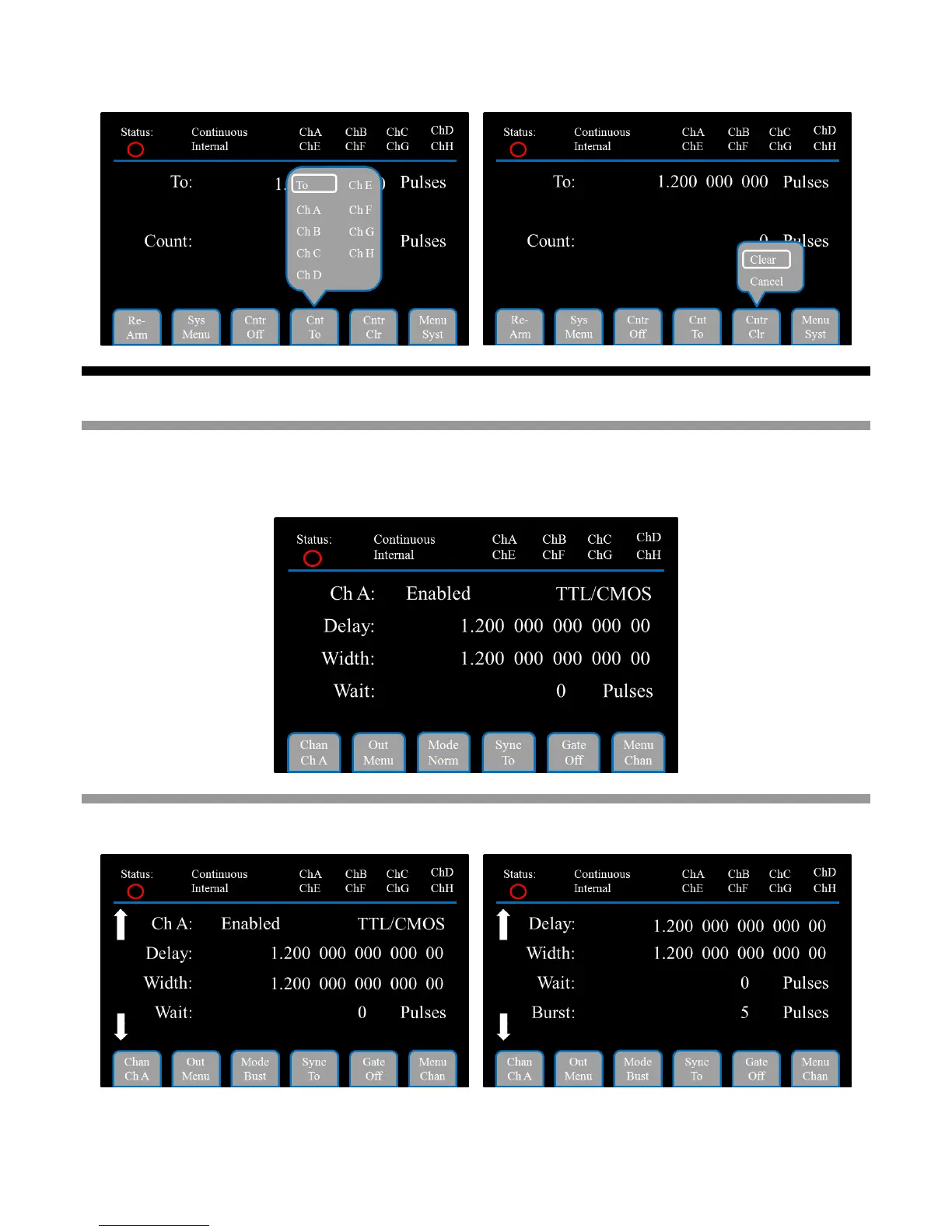 The Burst Mode Channel Menu page includes an additional parameter to set the number of pulses in the burst.