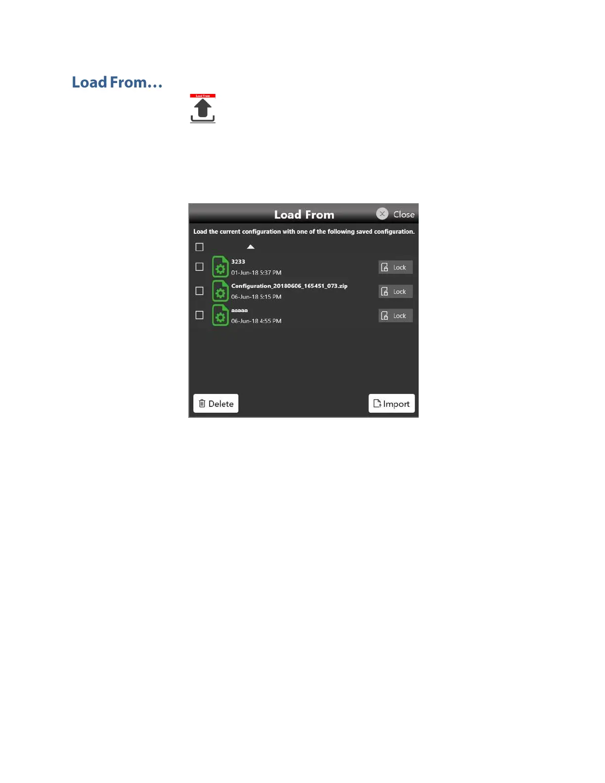 In the “Load From” page it is also possible to manage the configuration list: you can delete, import or