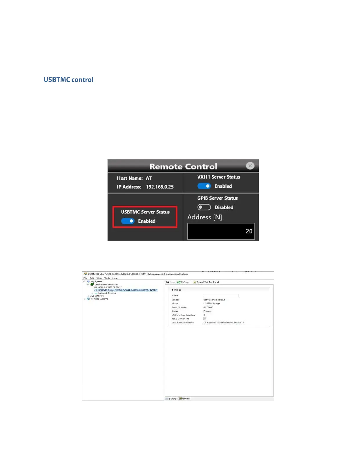 • In Remote Control Panel verify that USBTMC Server Status is Enabled; if not, press the button to