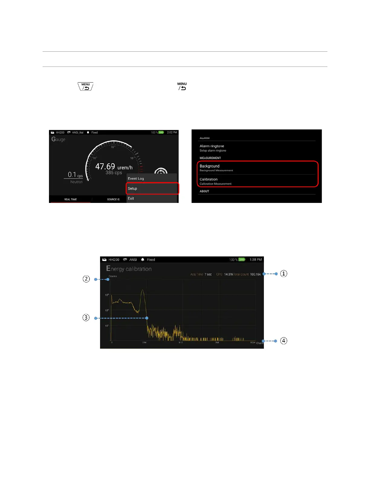 3. Calibration: place a calibration source (Cs-137) in front of the detector (minimum 3 inches away