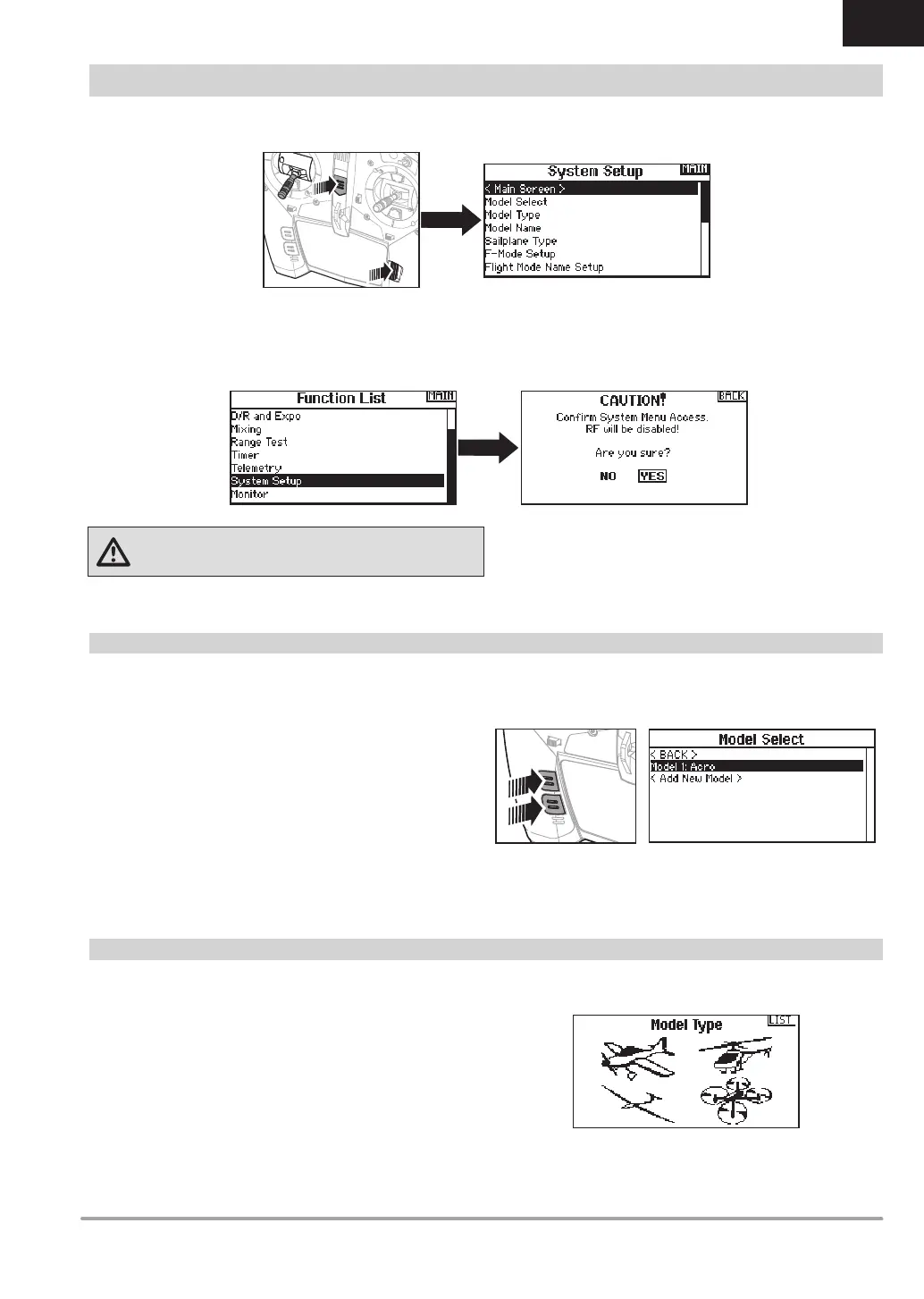 You can also enter the System Setup from the Function list without turning the transmitter off. A Caution screen will appear that warns that