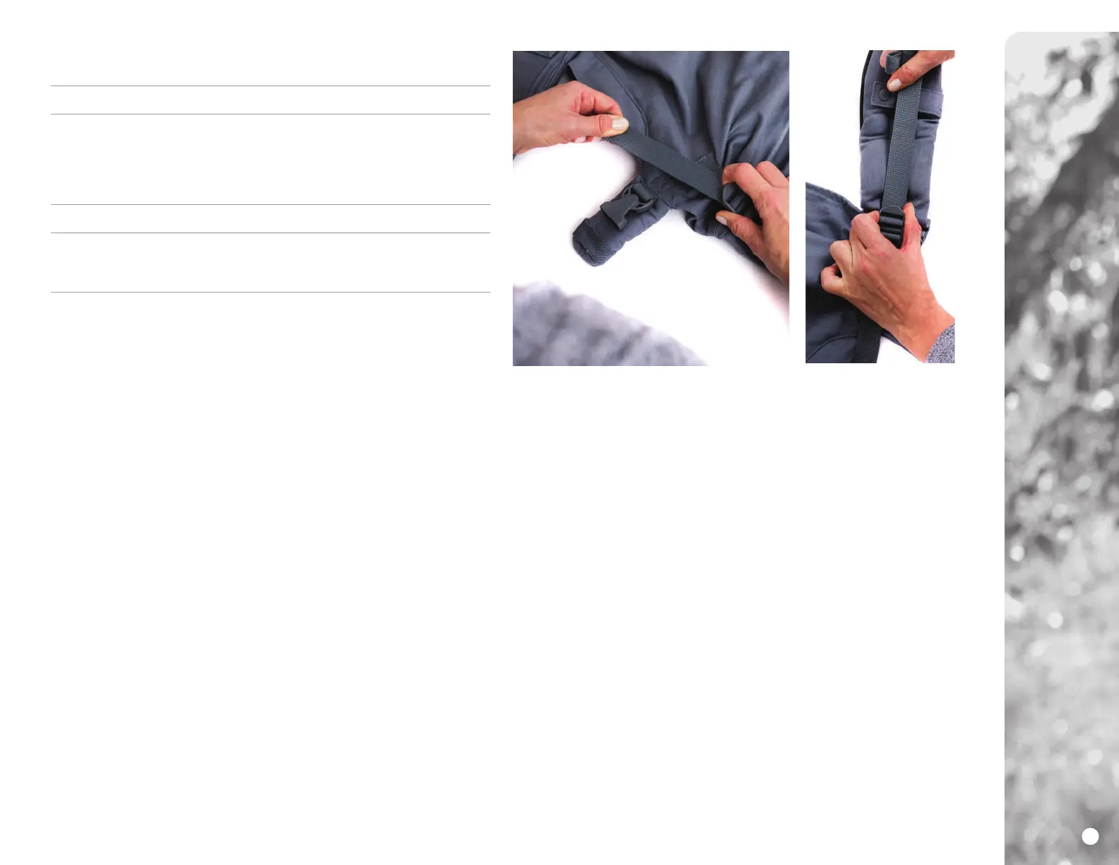 Ajustadores del panel • La altura del panel se puede ajustar tirando de la correa que se encuentra en la parte inferior de la hebilla. Acorte el panel para que se ajuste al