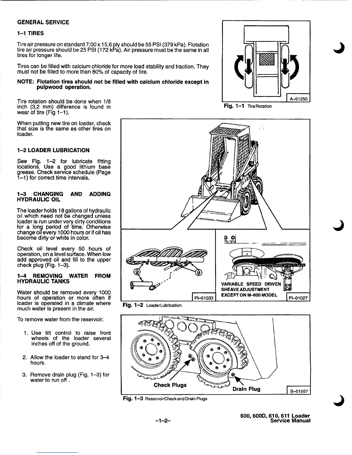 Bobcat 600 - Tires; Tire Pressure and Rotation; Tire Filling with Calcium Chloride; Loader Lubrication