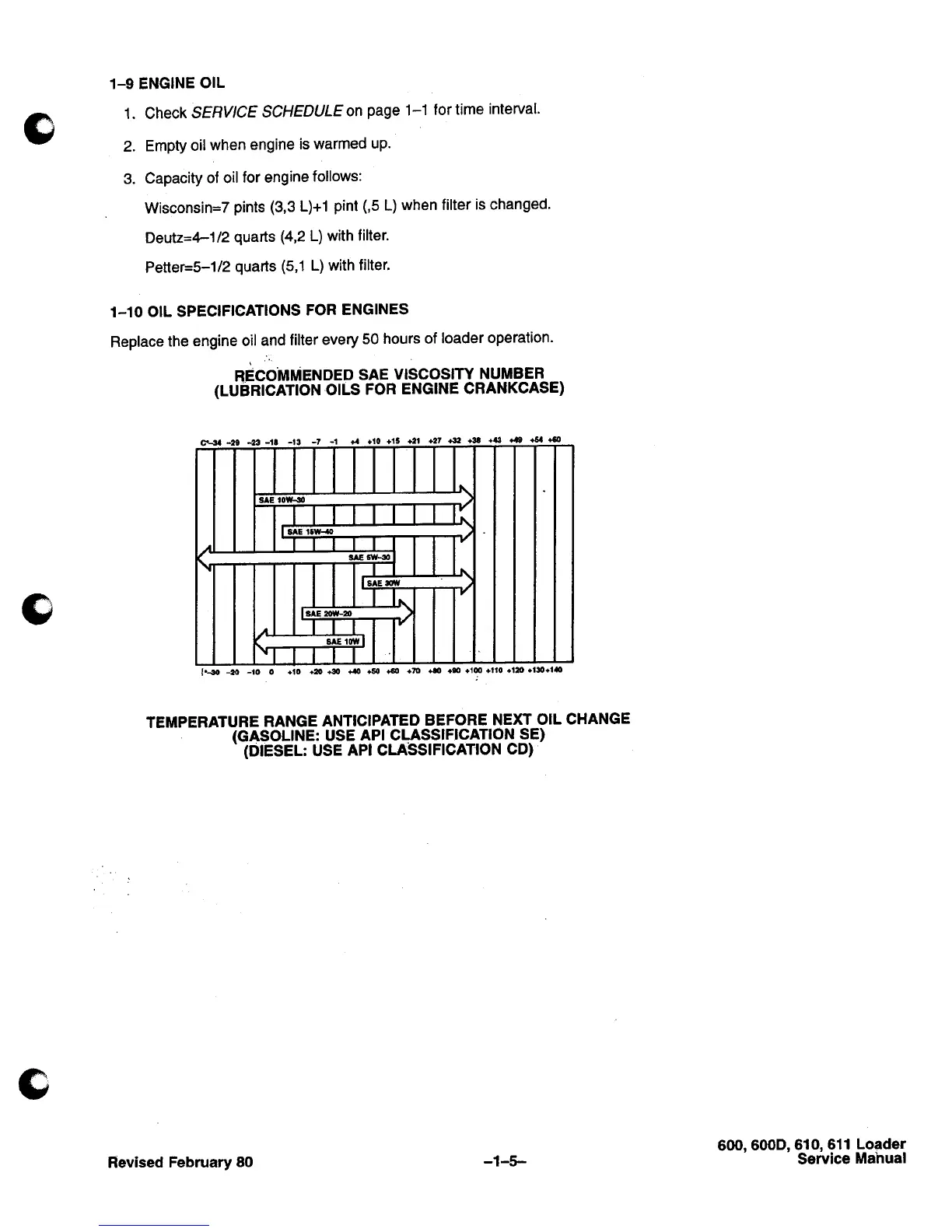 Bobcat 600 - Engine Oil Replacement; Engine Oil Capacity; Engine Oil Specifications; SAE Viscosity and Temperature Chart