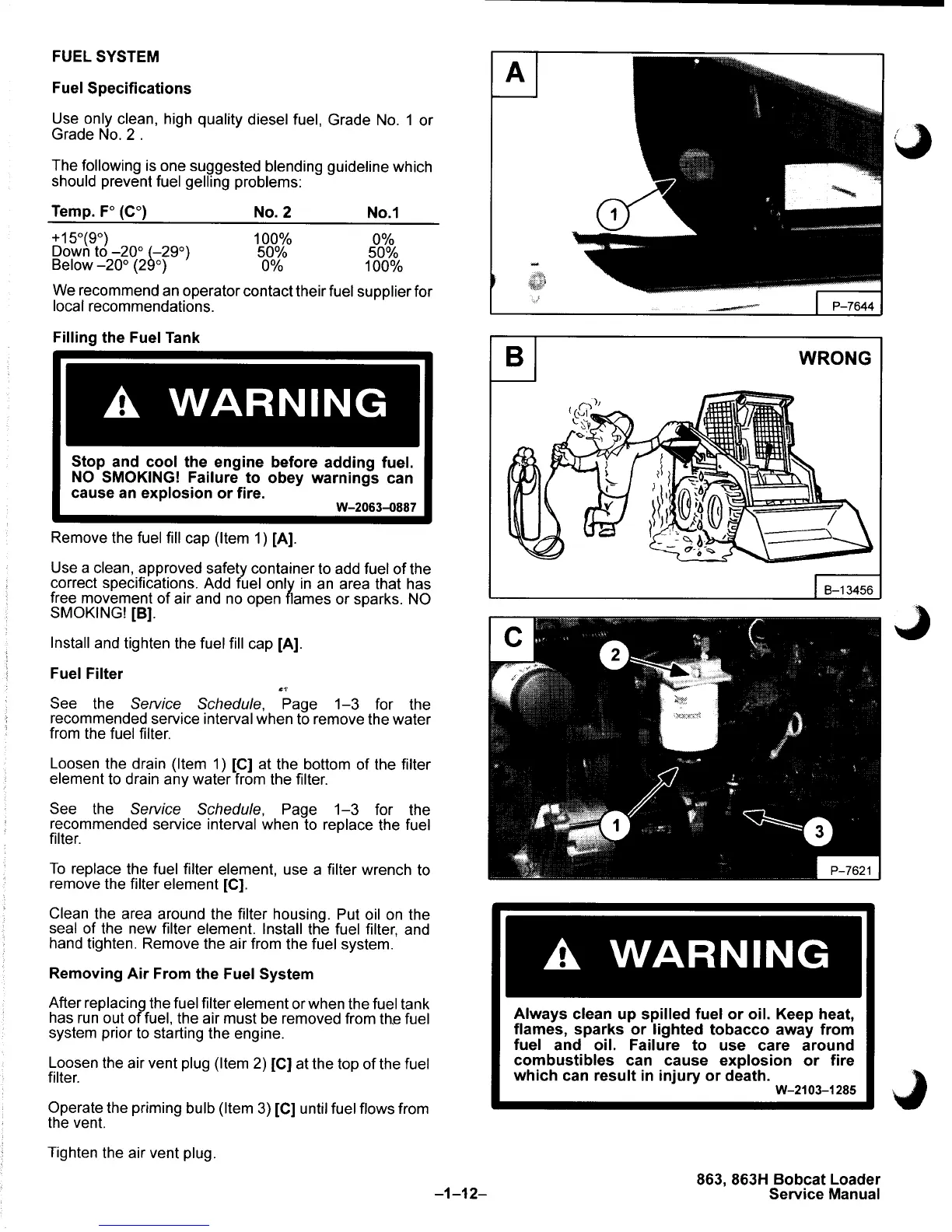 Bobcat 863 - Fuel System; Fuel Specifications; Filling the Fuel Tank; Fuel Filter