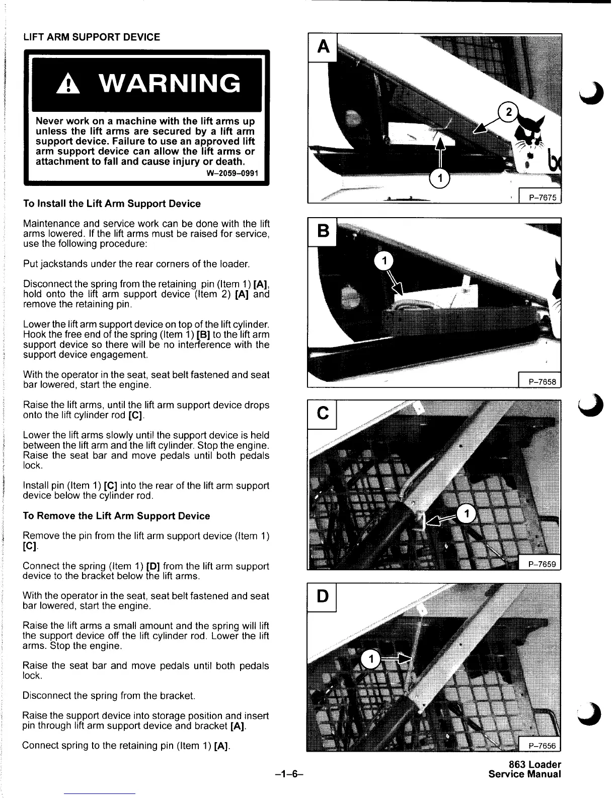 Bobcat 863 - Lift Arm Support Device; To Install the Lift Arm Support Device; To Remove the Lift Arm Support Device