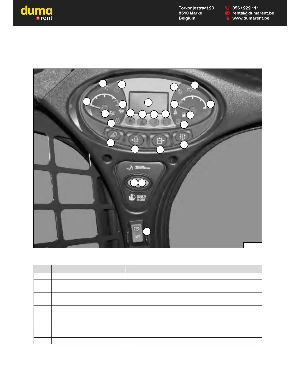 11 PARKING BRAKE The light is on when the loader cannot be driven.