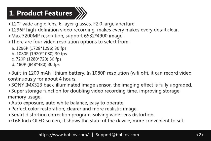 >Built-in 1200 mAh lithium battery. In 1080P resolution (wifi off), it can record video
