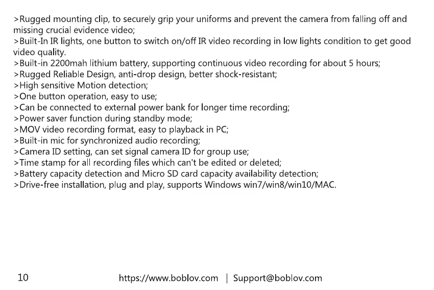 >Built-in 2200mah lithium battery, supporting continuous video recording for about 5 hours;