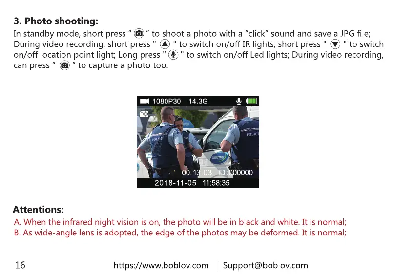 In standby mode,short press" @"to shoot a photo with a "click"sound and savea JPGfile;