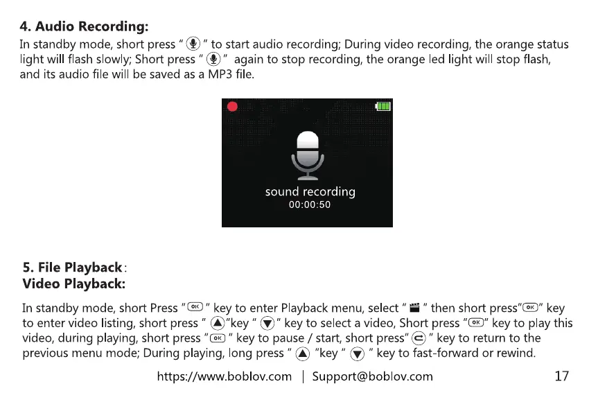 In standbymode,shortpress"@"to startaudiorecording;Duringvideorecording,the orangestatus