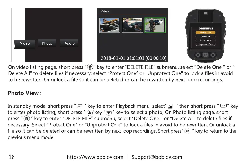 Onvideolistingpage,shortpress"O" keyto enter"DELETEFILE"submenu,select"DeleteOne" or