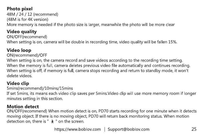 ON/OFF(recommend) When motion detect is on, PD70 starts recording for one minute when it detects