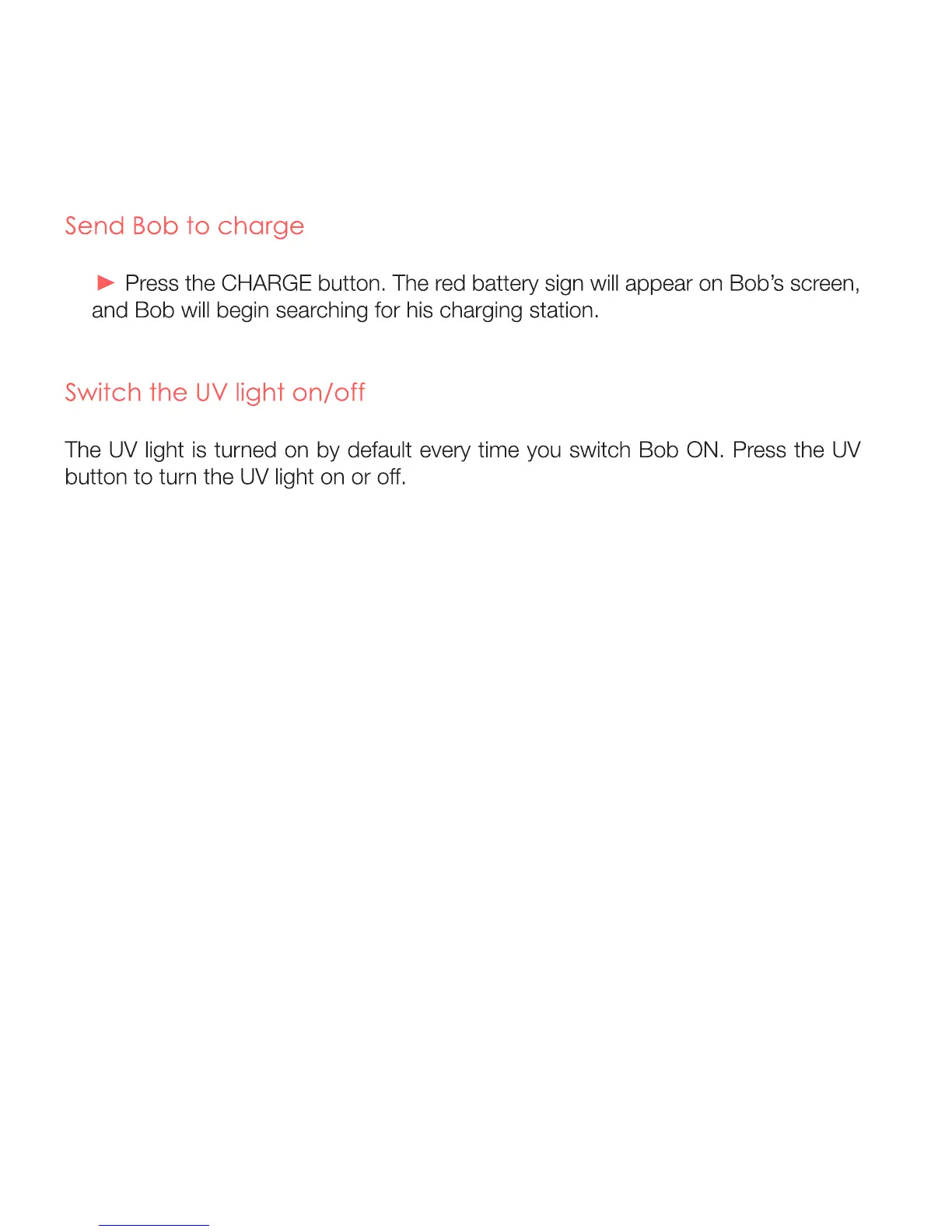 bObsweep PetHair - Send Bob to Charge; Switch the UV Light On;Off
