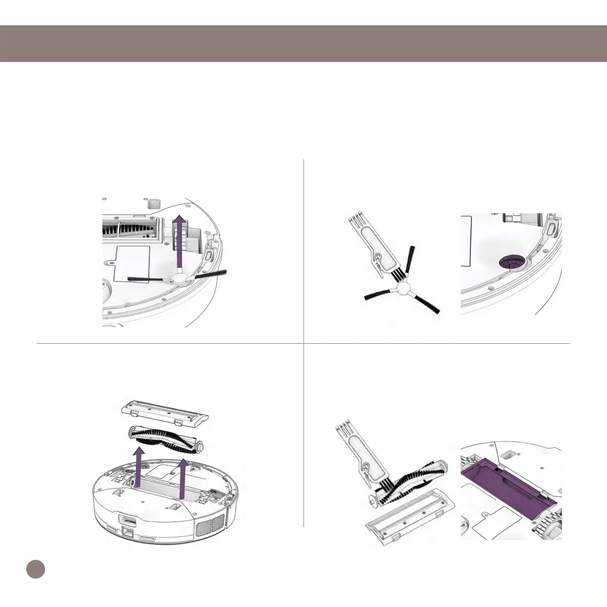 1. Pull up to remove the side brush. 2. Remove debris from the side brush and