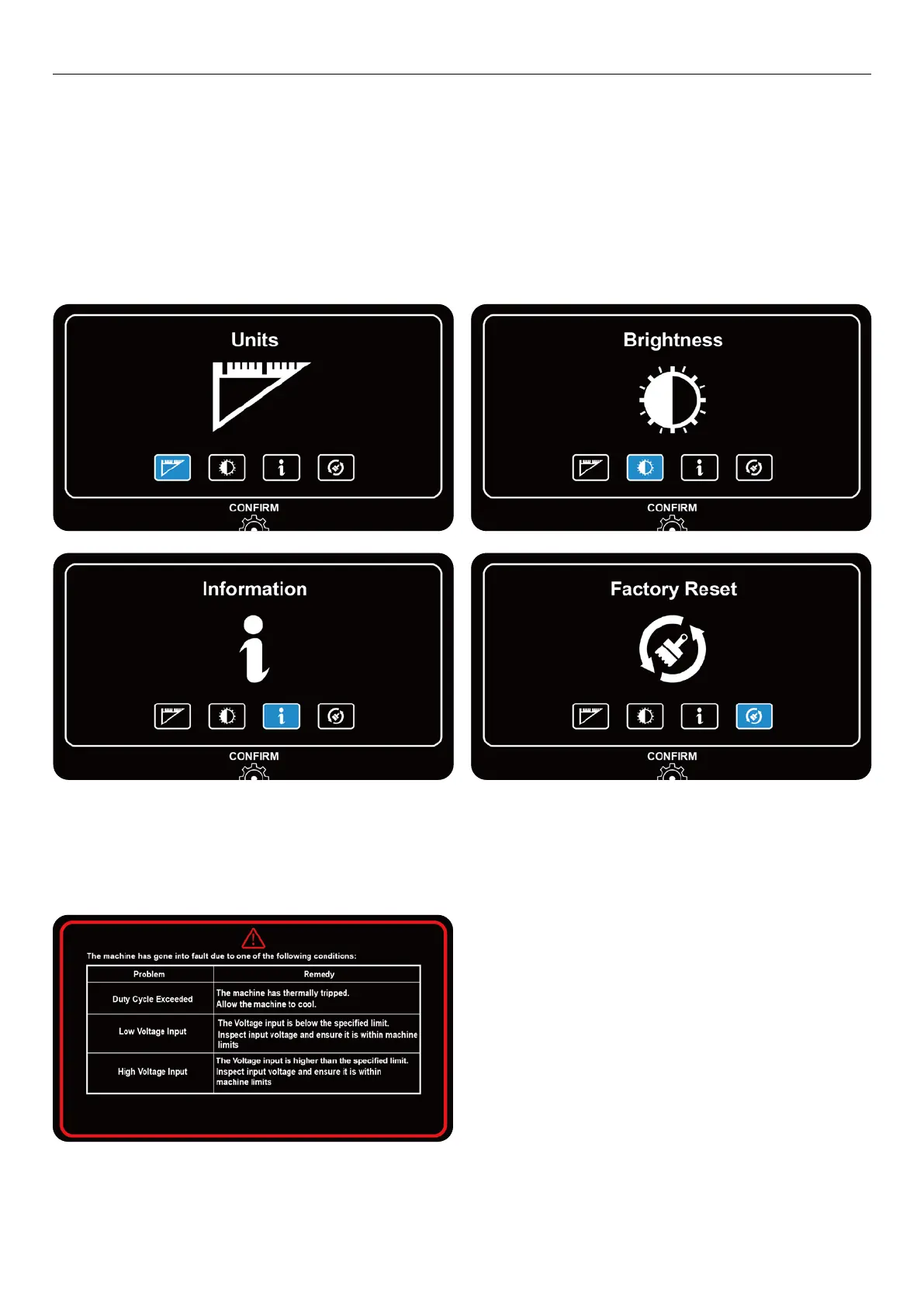 Use this option for adjusting Units, Brightness, view software version, and Factory Reset.