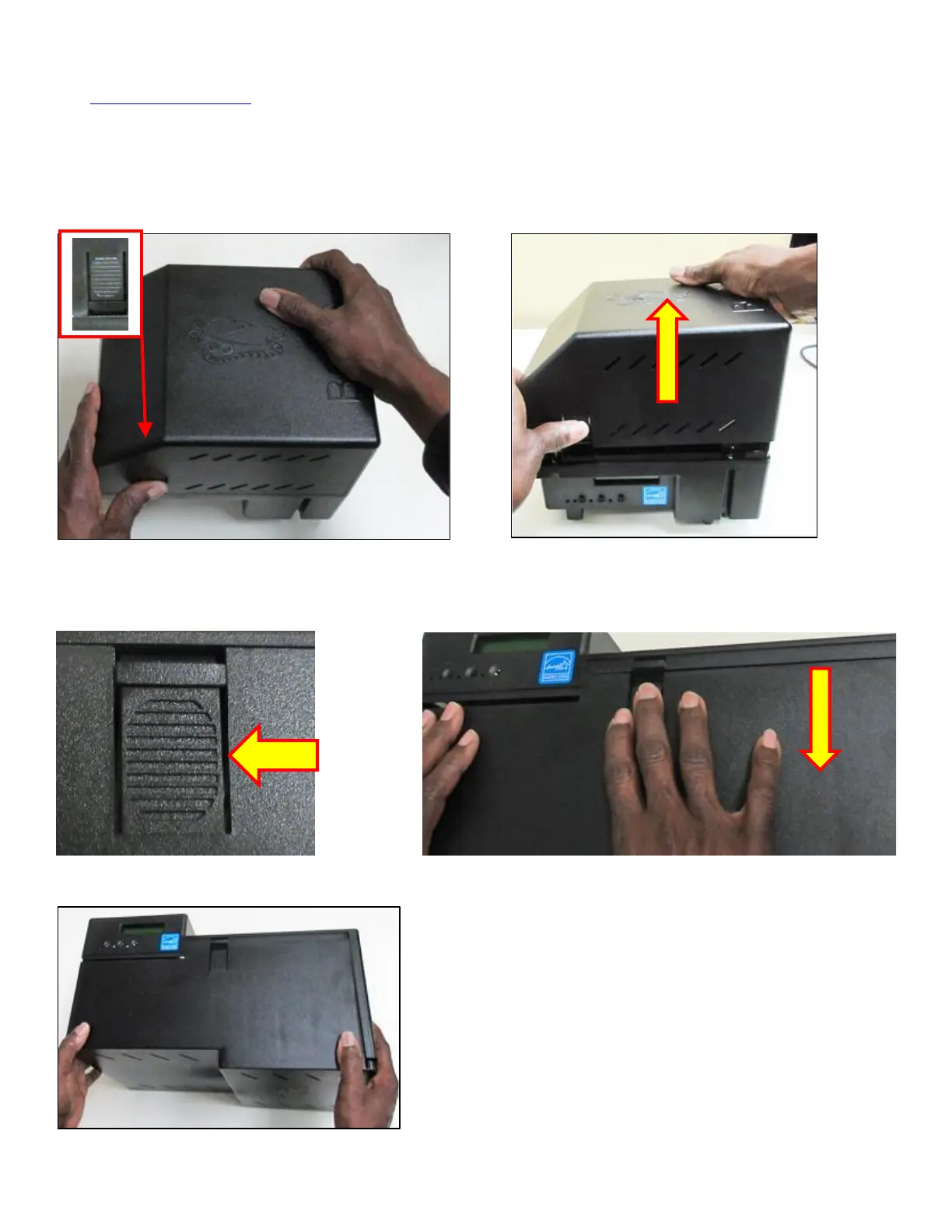 Depress the locking tab on the side of the printer. With two hands lift straight up on the cover to remove.