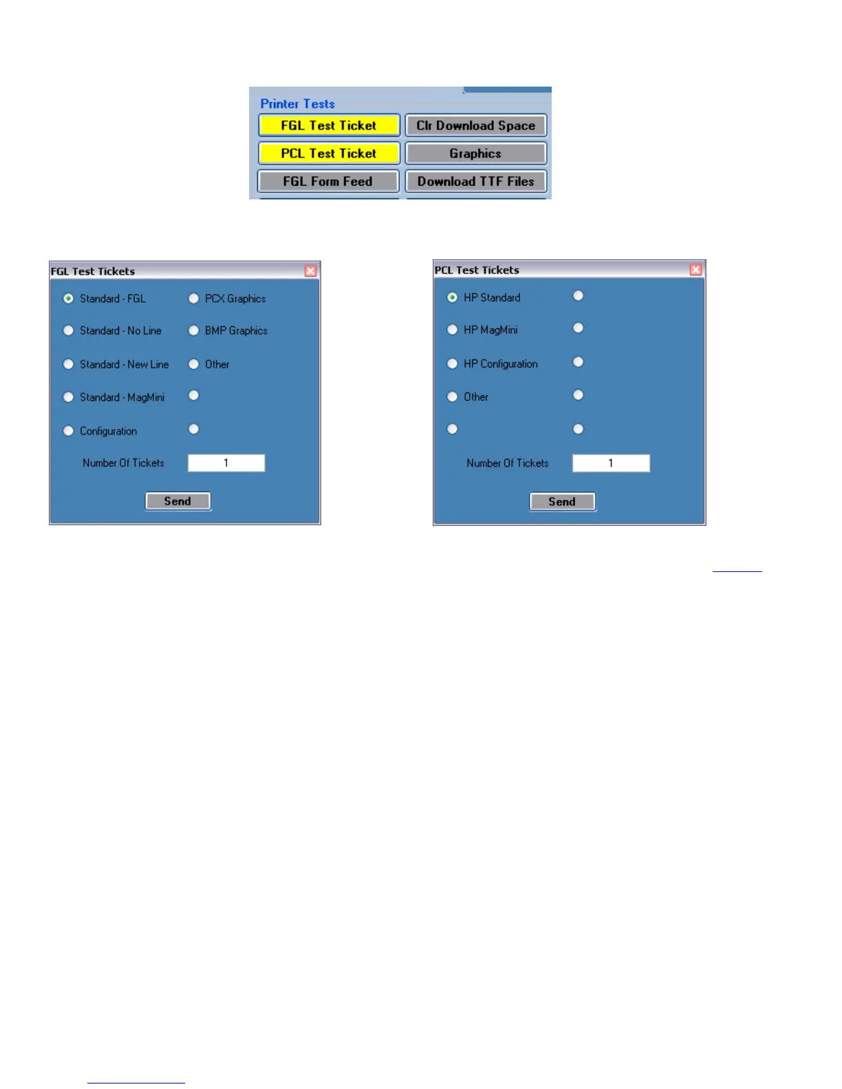 6. If your printer has FGL firmware then click on the yellow “FGL Test Ticket” button or if your printer has HP