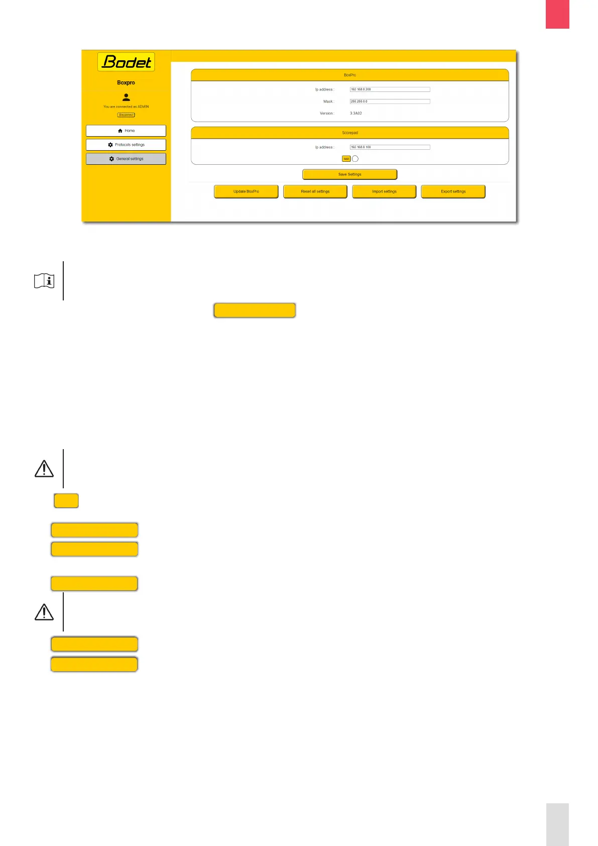 The General settings page allows to access the BOXPRO conguration as well as to proceed with its