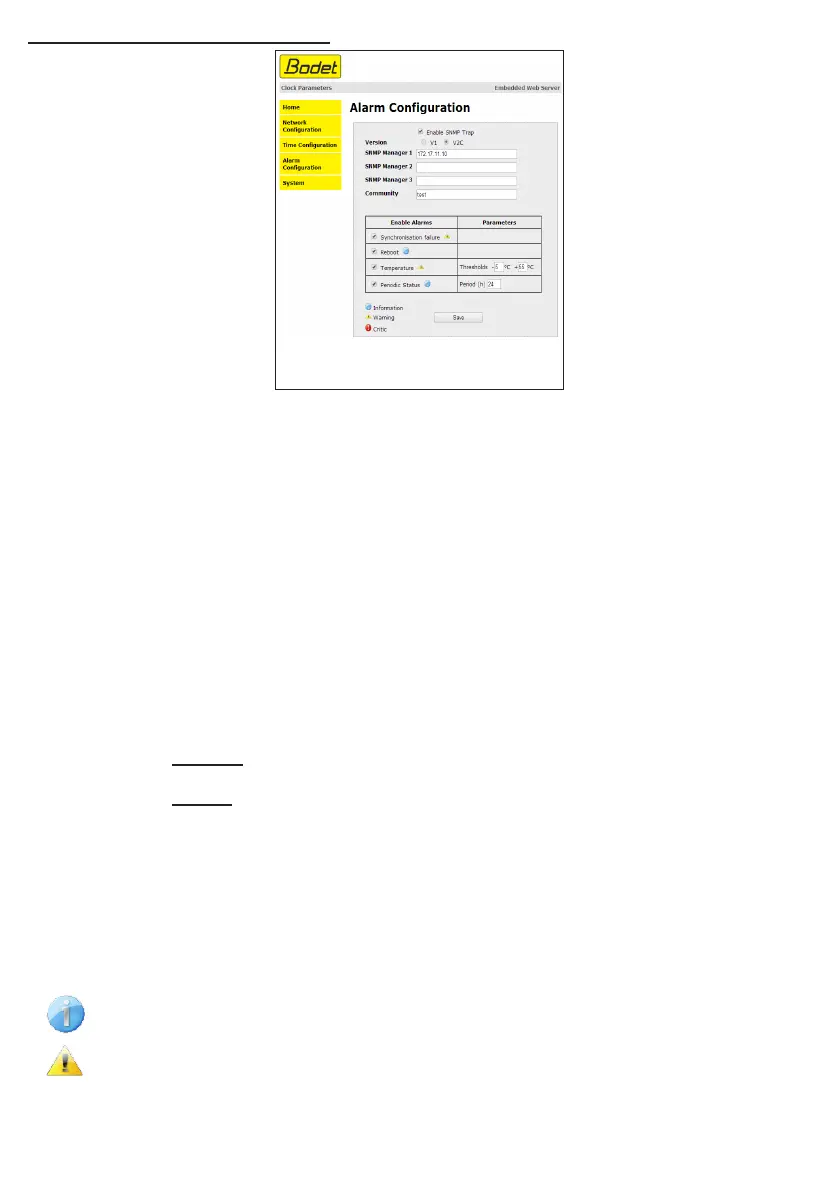 - SNMP Manager 1/2/3 : adresses IP des serveurs recevant les alarmes des horloges. La